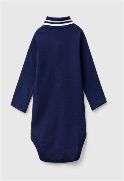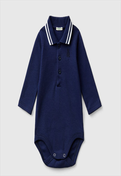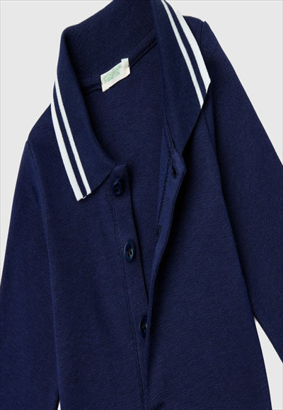 بدلة طويلة الأكمام على شكل بولو من القطن العضوي الخالص. ياقة كلاسيكية بنقشة مضلعة، فتحة جزئية بأزرار أمامية، أزرار كبس عند المنشعب، شعار أرنب مطرز على الثدي الأيسر. نمط غير رسمي في نسخة الطفل.