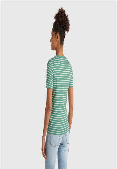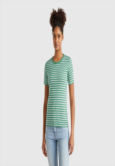 تيشيرت بأكمام قصيرة بنقشة مخططة مصبوغة بالخيوط. قصة عادية وشعار مطرز أسفل اليسار. مصنوع من قطن طويل الألياف فاخر، ناعم ومتين ولطيف الملمس. مثالي لإطلالة بلون واحد.