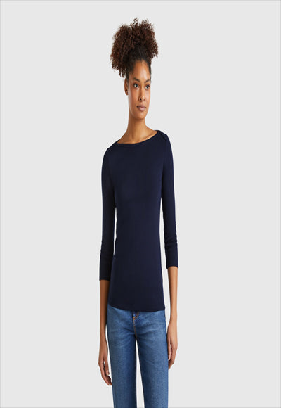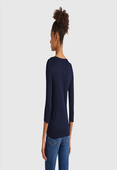 تيشيرت بقصّة عادية، بياقة قارب وأكمام ثلاثة أرباع. مصنوع من قطن طويل الألياف ١٠٠٪، ناعم ومريح ومتين.