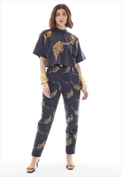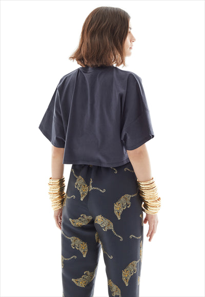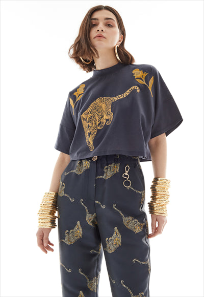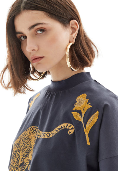 بلوزة منقوشة بروسومات باللون الذهبي , اكمام قصيرة , طول قصير ,قمشاة خفيفة مريحة