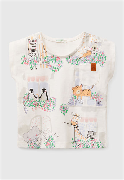 تيشيرت بياقة دائرية وأكمام قصيرة من القطن العضوي الناعم. قصة مربعة مع جيب على الصدر الأيسر، وطبعة حيوانية مع شعار أمامي. فتحة عملية بأزرار كبس مخفية على الكتف. مصنوع من قماش يحتوي على 95% قطن عضوي على الأقل.