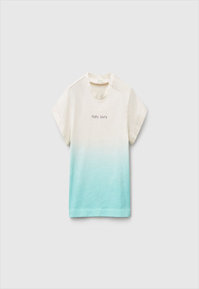 تيشيرت بأكمام قصيرة وياقة دائرية من القطن الخالص بلمسة دافئة. فتحة عملية بأزرار كبس على الكتف الأيسر وطبعة على الجهة الأمامية. تأثير ديجراديه مُكتسب من خلال عملية صباغة خاصة تجعل كل قطعة فريدة.