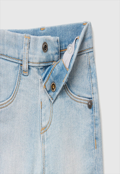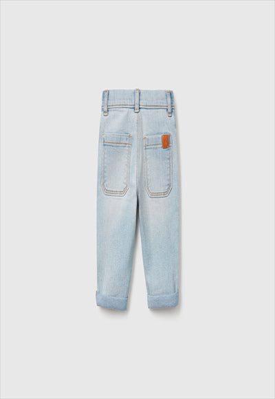 بنطال طويل من قماش الدنيم القطني المرن الممزوج. خصر داخلي مرن، قلاب صغير بزر كبس، وطيّ عند فتحة الساق. جيوب أمامية وجيوب خلفية. لإطلالة عصرية ومريحة، نسخة للأطفال.