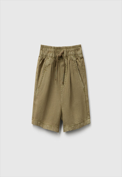 شورت من مزيج الليوسيل والكتان الناعم والخفيف. خصر مطاطي برباط وجيوب أمامية. تصميم كاجوال وعصري بطبعة أطفال.