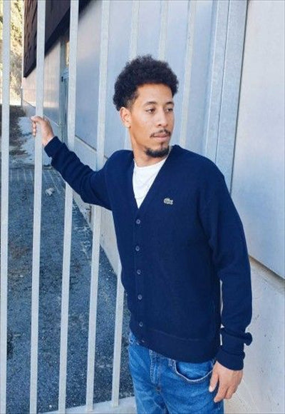 جاكيت رجالي محبوك مع زر للإغلاق، بدون ياقة، فتحة رقبة على شكل حرف V، مع الشعار الأمامي الشهير التطريز العلامة التجارية. وعلى النقيض من ذلك، هناك خط أخضر على جانب السترة. المرجع: ah0397 التركيب: 100% صوف