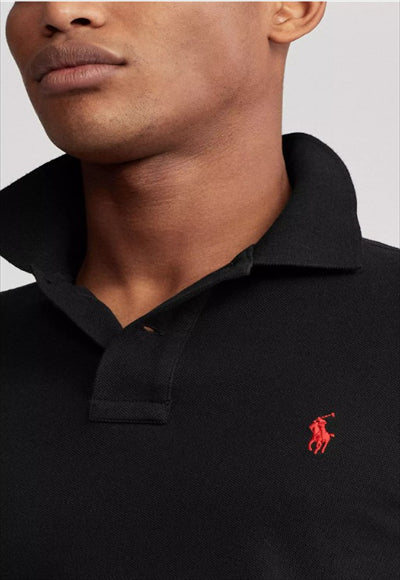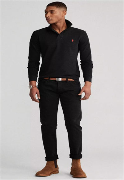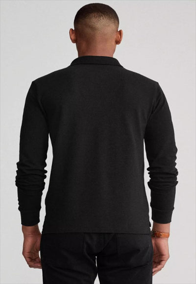 قميص بولو أسود بأكمام طويلة من بولو رالف لورين. شعار مطرز باللون الأحمر على الصدر الأيسر. ياقة وأساور أكمام مضلعة. مصنوع من القطن بنسبة 100%.