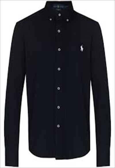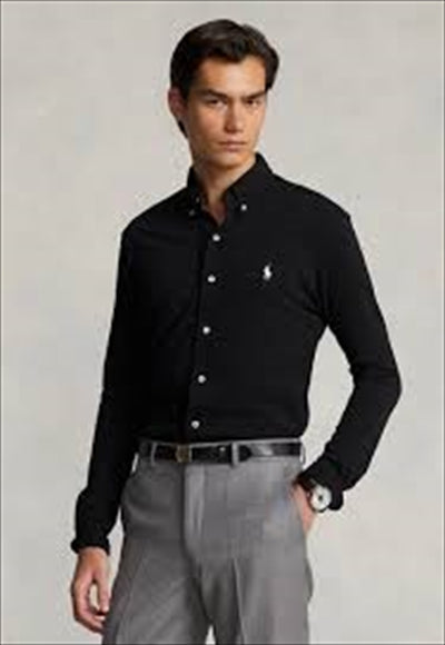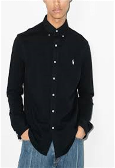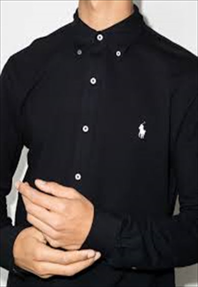قميص بولو عصري باللون الأسود، بقصّة عادية، وأكمام طويلة، مصنوع من قماش قطني ١٠٠٪.
