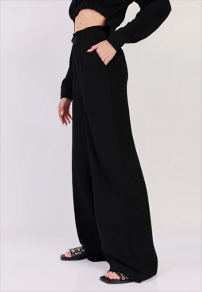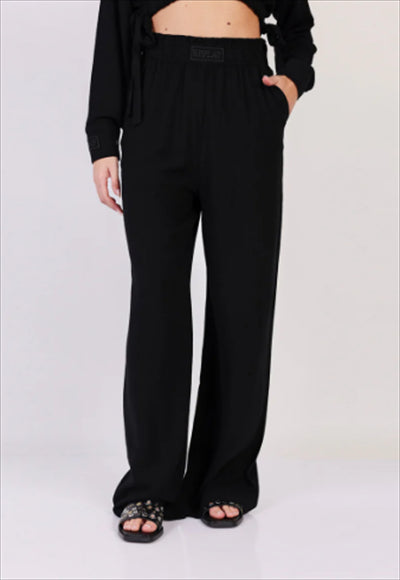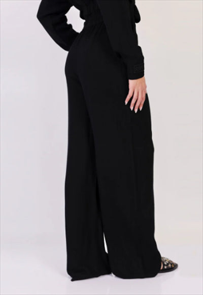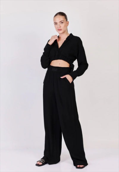بنطلون طويل بقصة واسعة مع شريط مطاطي عند الخصر. يحتوي البنطلون على قميص بأزرار سفلية متطابقة.