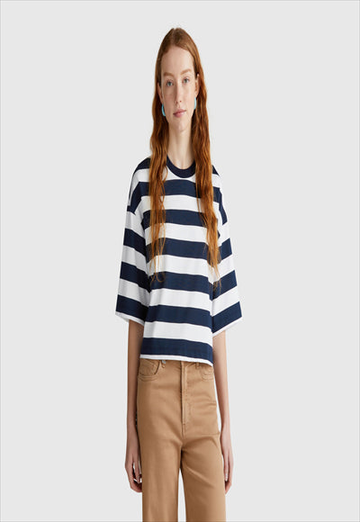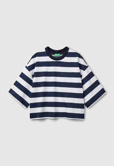تيشيرت بأكمام قصيرة ورقبة دائرية من القطن الخالص الناعم. قصة مربعة بنقشة مخططة بلونين. تصميم أيقوني ومريح.