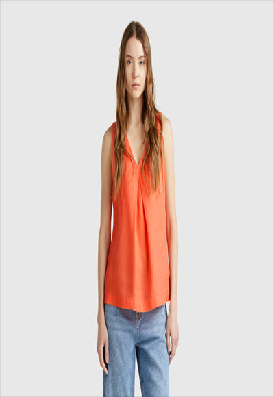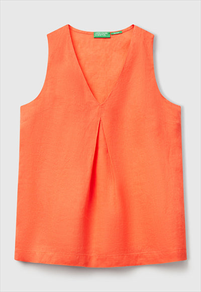 بلوزة خفيفة الوزن بدون أكمام بقصة واسعة. طول يصل إلى الورك وقصة مريحة، مع رقبة على شكل حرف V وثنية أمامية. مصنوعة من خامة كتان ١٠٠٪ مزروعة في أوروبا.
