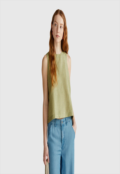 بلوزة بدون أكمام من مزيج القطن والكتان الناعم. نقشة مخططة مصبوغة بالخيوط، رقبة دائرية وفتحة أزرار في الخلف. أنيقة وأنثوية.