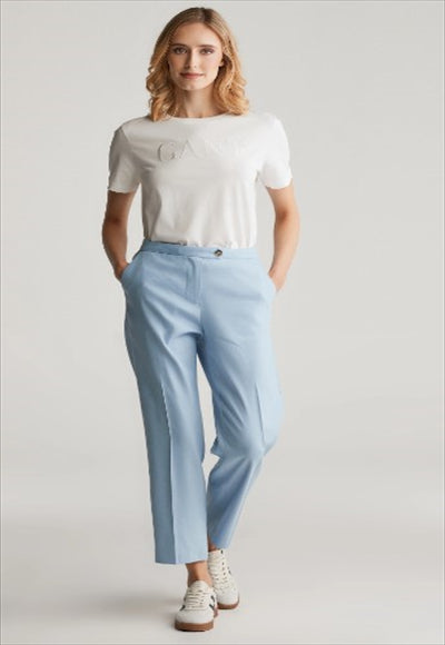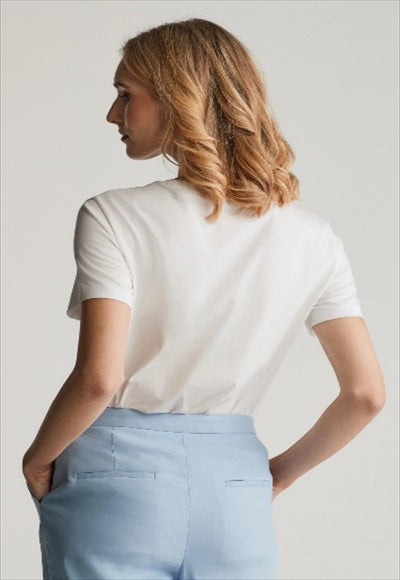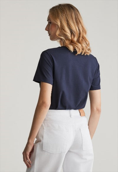تيشيرت نسائي بقصة مستقيمة، مزين بتطريز شعار غانت بلون متناغم على الصدر. تصميم كاجوال بياقة دائرية وأكمام قصيرة، يكمله حاشية مضلعة عند الرقبة. خامة قطنية فاخرة 100% تضمن تهوية مثالية وراحة قصوى عند الارتداء. قطعة عملية وسهلة الارتداء تُكمل إطلالتك الصيفية بأناقة.