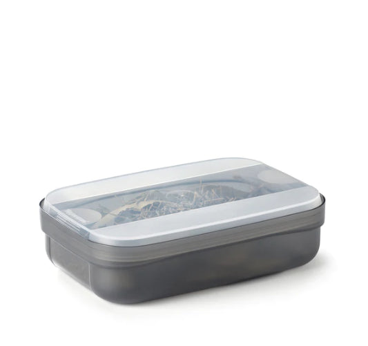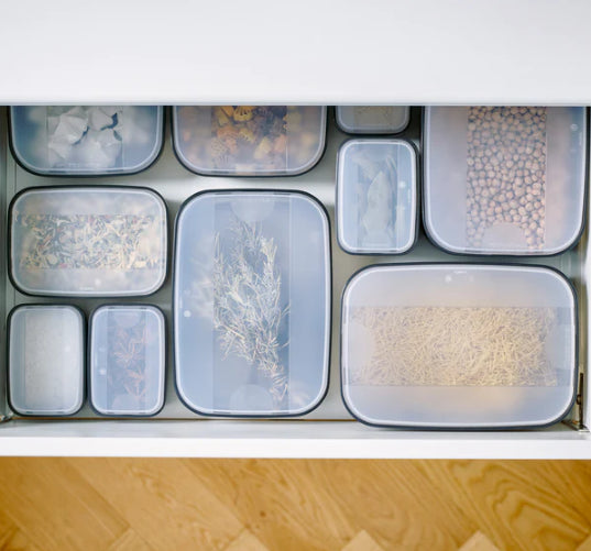 تحتوي الحاويات على أغطية شفافة تتيح لك التعرف بسرعة على محتوياتها ، ويمكن فتحها بسهولة عن طريق الضغط بإبهامك على الدائرة الخشنة على جانب واحد من الغطاء والسحب بأطراف أصابعك على الجانب الآخر. للإغلاق ، ضع الغطاء على الحاوية واضغط لأسفل بإبهامك على كلا الجانبين في نفس الوقت. من السهل تقديم الطعام أو قياسه من الحاويات دون إزالته من الدرج ؛ يمكنك أيضًا استخدام المغرفة المطابقة وحتى الاحتفاظ بها داخل إحدى الحاويات. يسهل ملء الحاويات في المجموعة وتنظيفها ، وهي متوفرة بأحجام وارتفاعات متنوعة تلبي جميع احتياجات التخزين الخاصة بك.