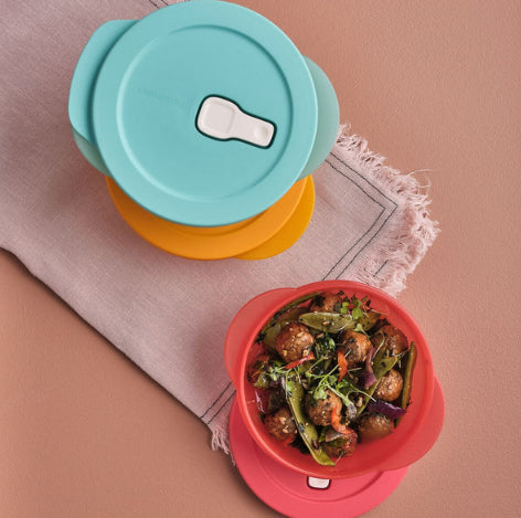 تعتبر مجموعة الكريستال الدائرية من Tupperware مثالية للتدفئة أو إعادة التسخين في الميكروويف. ما عليك سوى وضع الطعام داخل الحاوية ، وإغلاق الغطاء ، وفتح الفتحة أثناء التسخين في الميكروويف ، وأخيراً أغلقها للحفاظ على الحرارة. بدون فوضى فيلم التشبث! عظيم كعلبة غداء في العمل!