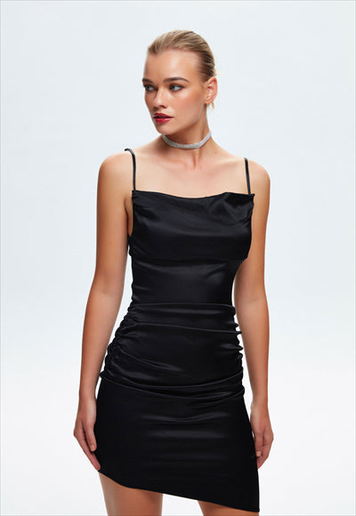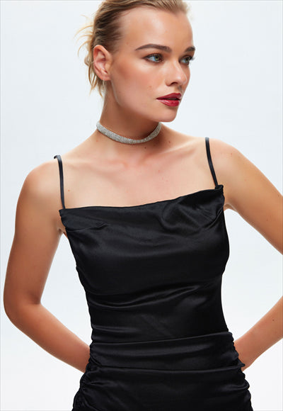 فستان منسدل حمالة بسحاب القماش: 100% فيسكوز الأكمام: بدون أكمام نوع الياقة: ياقة على شكل وشاح النمط: سادة القصّة: قصّة عادية الأسلوب: فستان سهرة مقاس العارضة المقاس: 36 الارتفاع: 173 سم الصدر: 85 سم الخصر: 60 سم الورك: 90 سم