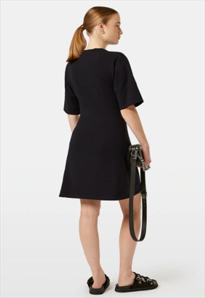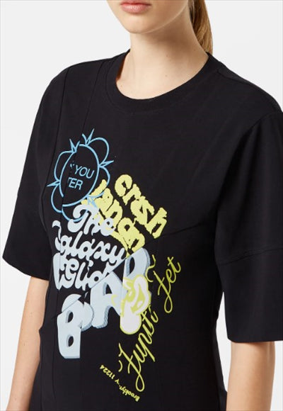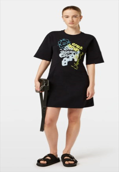 يتميز هذا الفستان الكاجوال بتصميم جريء على قماش جيرسي ناعم، يمزج بين الراحة والطابع الشخصي.