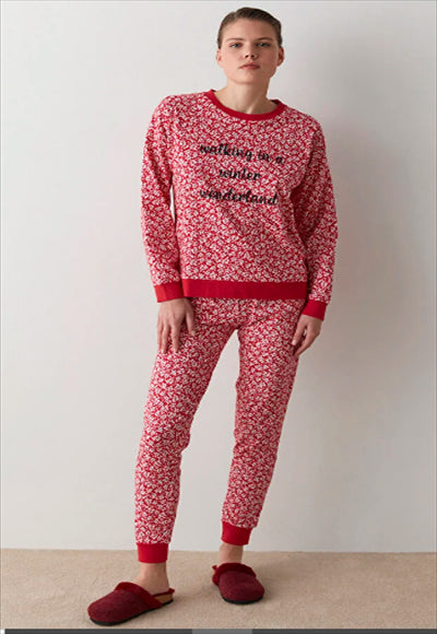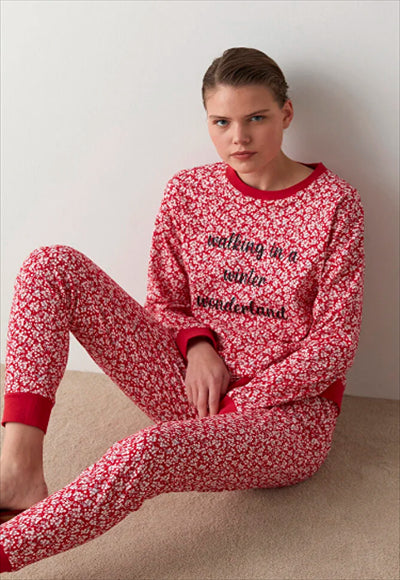 طقم بنطلون سوف يدفئ روحك وجسدك! طقم بنطلون يتكون من بنطلون بتفاصيل أساور وقميص بأكمام طويلة وأساور، مزين بنقوش زهور صغيرة من الرأس إلى أخمص القدمين. وزين القميص بطبعة نصية "المشي في بلاد العجائب الشتوية"، بينما البنطلون؛ ويكتمل بأساور تتطابق مع ياقة القميص وحاشية وأساور الأكمام. طقم بنطلون يدفئ جسدك بتغليفه بلمسات ناعمة، بفضل نسيجه القطني 100%. بفضل هيكله المرن، فهو يحررك ويسمح لك بالشعور براحة أكبر طوال اليوم. فهو يوفر لك الفرصة للنوم بسلام طوال الليل والقيام بأعمالك اليومية بحرية