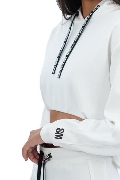 تنورة قصيرة وبلوزة بقلنسوة باللون الأبيض