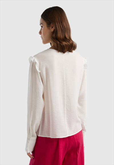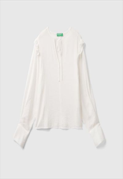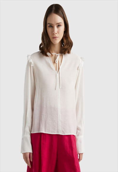 بلوزة مصنوعة من مزيج الفيسكوز الناعم وخفيف الوزن بقصة عادية. فتحة عنق على شكل ثقب المفتاح مع أربطة لربطها في الأمام. أكمام طويلة بالون مع روش على فتحات الذراعين. للملابس الكلاسيكية والأنيقة، مثالي تحت السترة.