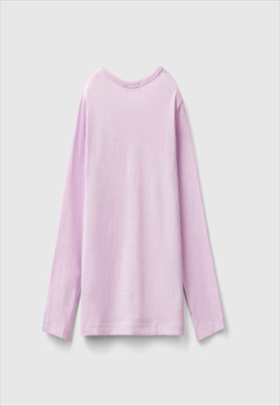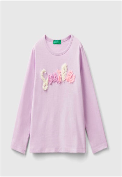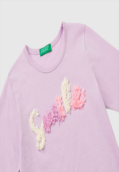 تي شيرت بأكمام طويلة ورقبة دائرية من القطن العضوي الخالص. مقاس عادي، مطبوع عليه زخارف خاصة على شكل بتلات الزهور. أنثوي وممتع. 100% قطن