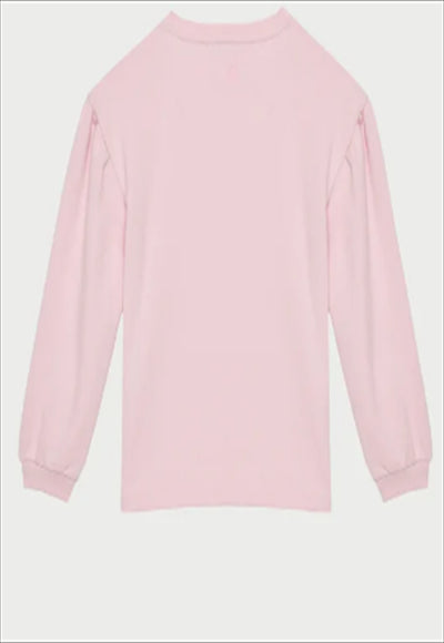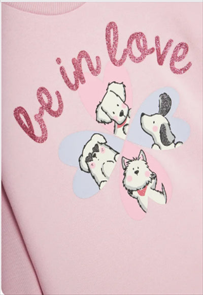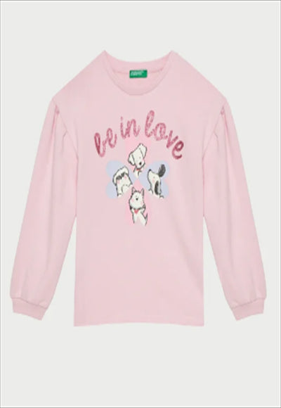 سويت شيرت برقبة دائرية مغلقة من قماش مزيج القطن الناعم. أكمام طويلة منفوخة قليلاً وأكتاف منسدلة. طبعة حيوانية مع شعار وتفاصيل لامعة على الجهة الأمامية. لمسة براقة لإطلالاتها اليومية.