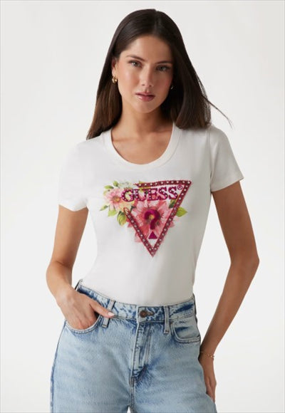 تيشيرت قطني مطاطي. ياقة دائرية كلاسيكية وأكمام قصيرة. قصة ضيقة أنيقة. شعار مثلث مزهر أمامي مزين بالخرز.