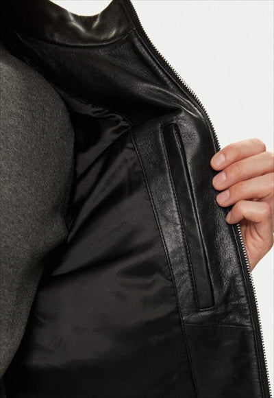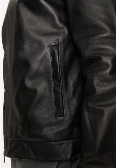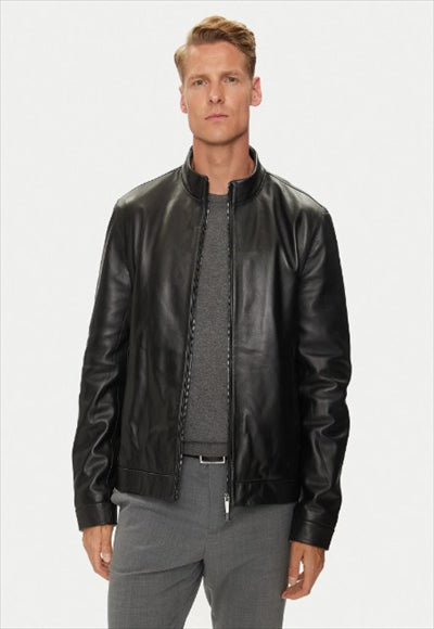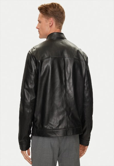 جاكيت جلدي أسود من كالفن كلاين. جاكيت من جلد الحمل الأسود، رقبة دائرية، سحاب أمامي ثنائي الاتجاه، أكمام طويلة، جيبان جانبيان، بطانة كاملة، جيب داخلي بسحاب وحاشية مستقيمة
