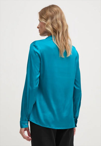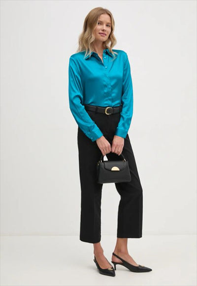 قميص بأكمام طويلة مصنوع من قطن الساتان الناعم بقصة مريحة. ياقة مدببة، فتحة أمامية مخفية بأزرار. مصنوع من مزيج الفسكوز، 97% فيسكوز، 3% إيلاستان