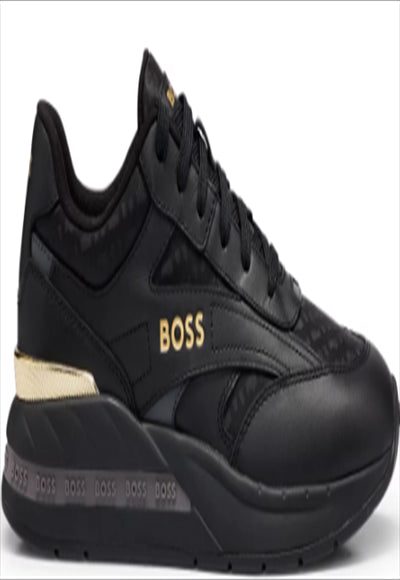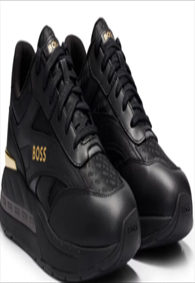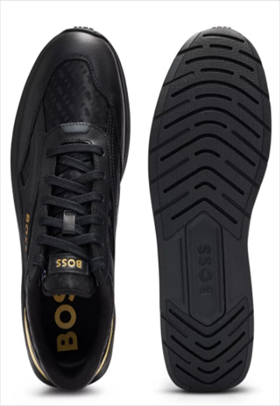 حذاء رياضي من BOSS، مصمم من الجلد العادي ومادة الجاكار المونوغرامي مع حقنة معدنية عند الكعب وعلامة تجارية في كل مكان.