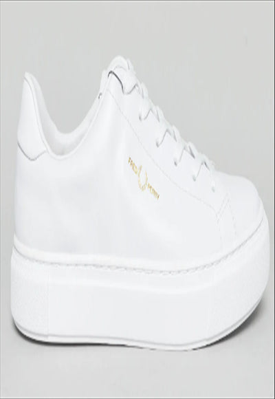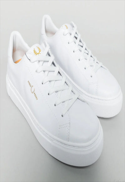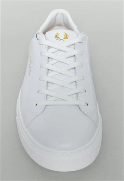حذاء فريد بيري B71 من الجلد باللون الأبيض. الأجزاء العلوية من الجلد الناعم المحبب بالكامل. العلامة التجارية فريد بيري منقوشة باللون الذهبي. جبهات الدانتيل الأبيض. لسان من الجلد الأبيض مع إكليل الغار المنقوش بالذهب. خياطة متقنة. نعال مطاطية بيضاء. جميع الأحجام القياسية في المملكة المتحدة.
