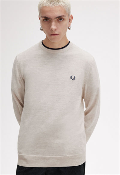 سترة محبوكة من مزيج القطن والصوف الميرينو / مقاس عادي / رقبة دائرية / حواف مضلعة / شعار إكليل الغار مطرز على الصدر الأيسر
