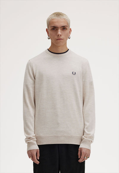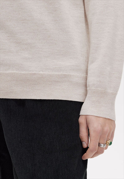 تلتقي البساطة بالفخامة في سترتنا المحبوكة من صوف الميرينو والقطن ذات الرقبة الدائرية، مع لمسة من الحافة المزدوجة على الياقة الداخلية.