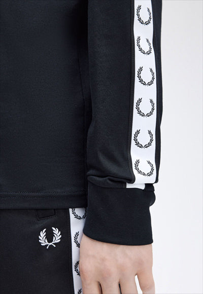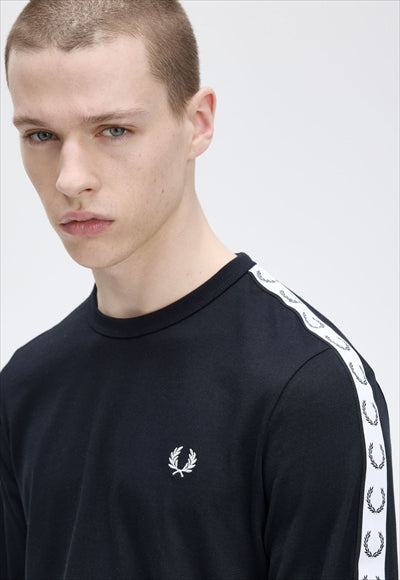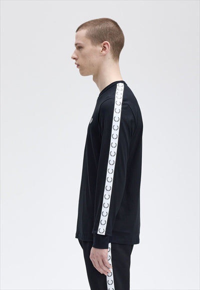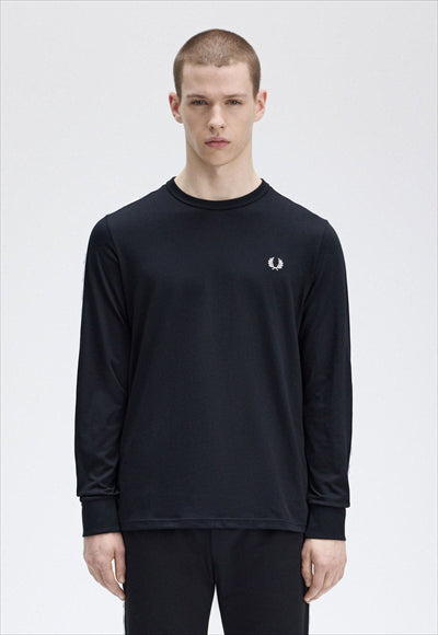 قميص تي شيرت بأكمام طويلة من قماش الجيرسي القطني، مصمم بشريط مسار Laurel Wreath الخاص بنا على الأكمام.