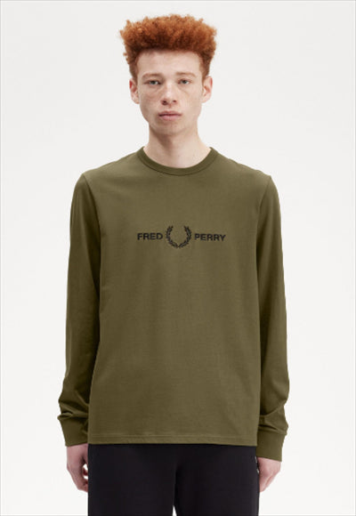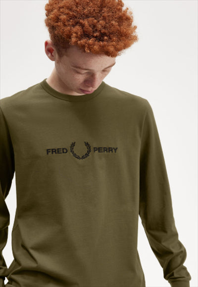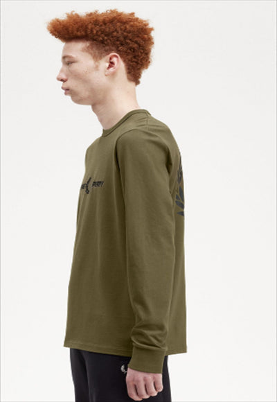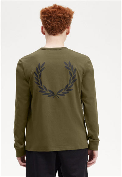 قطن جيرسي / مقاس عادي / رقبة دائرية وأساور مضلعة / تطريز Fred Perry على الصدر وطباعة جرافيك إكليل الغار على الجزء الخلفي من الجسم.