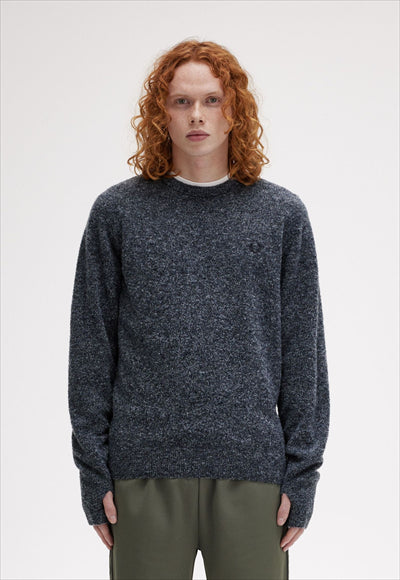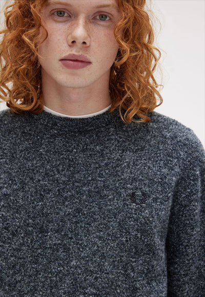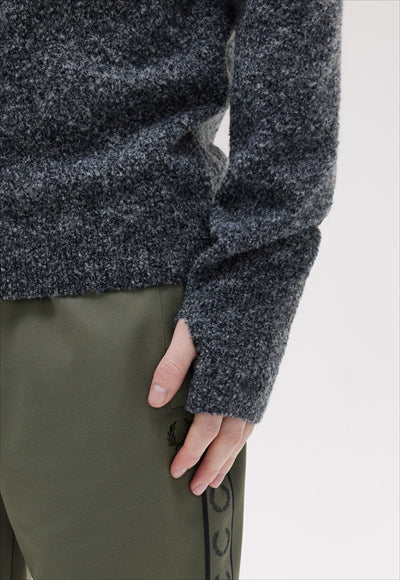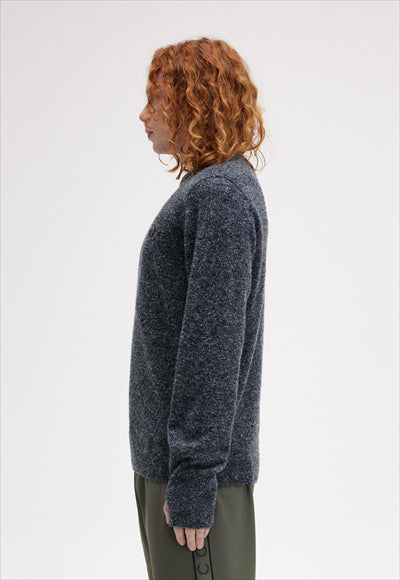سترة محبوكة من مزيج القطن والصوف الميرينو / مقاس عادي / رقبة دائرية / حواف مضلعة / شعار إكليل الغار مطرز على الصدر الأيسر