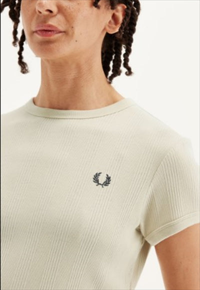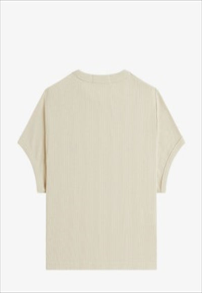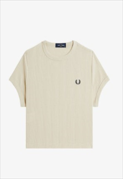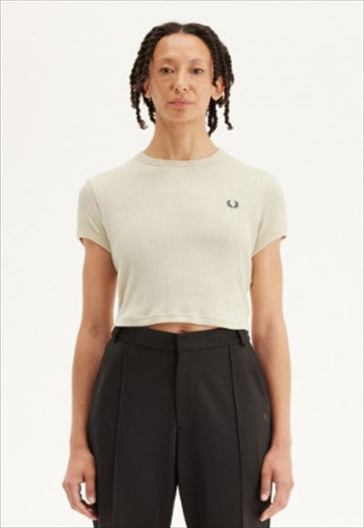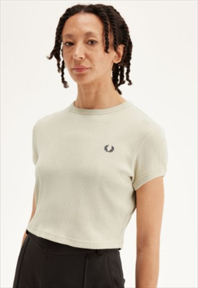تيشيرت بياقة دائرية وقصة ضيقة عند منتصف الخصر. نسيج مزيج من القطن والبوليستر المُعاد تدويره / قصة عادية وطول أقصر / ياقة دائرية وأساور مضلعة / حافة دائرية / شعار إكليل الغار مطرز على الصدر الأيسر.