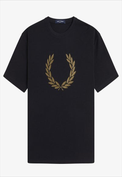 قماش بيكيه قطني / رقبة دائرية / طباعة معدنية لشعار إكليل الغار في منتصف الصدر