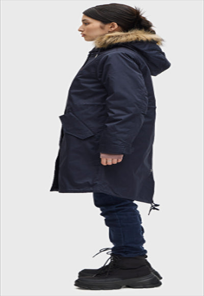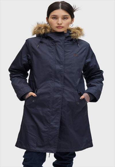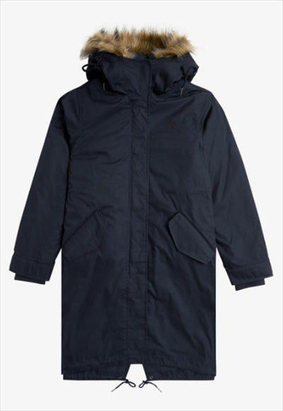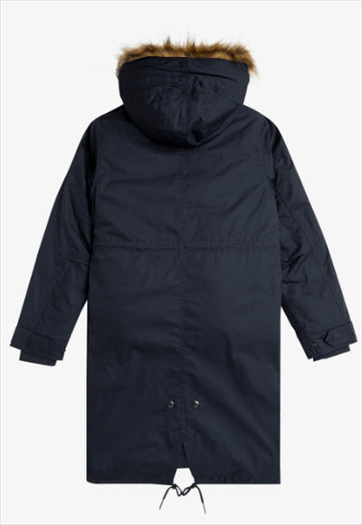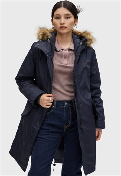 سترة بغطاء ذيل السمكة من تصميم فريد بيري. الجسم مصنوع من النايلون القطني خفيف الوزن، والجسم مزود بحواف من الفرو الصناعي قابلة للإزالة، وجيوب بغطاء، وحبال سحب عند غطاء الرأس، والخصر.