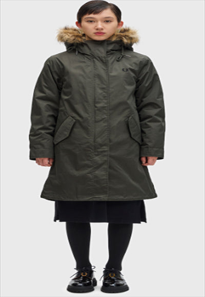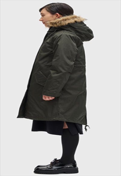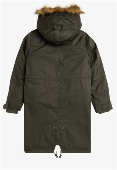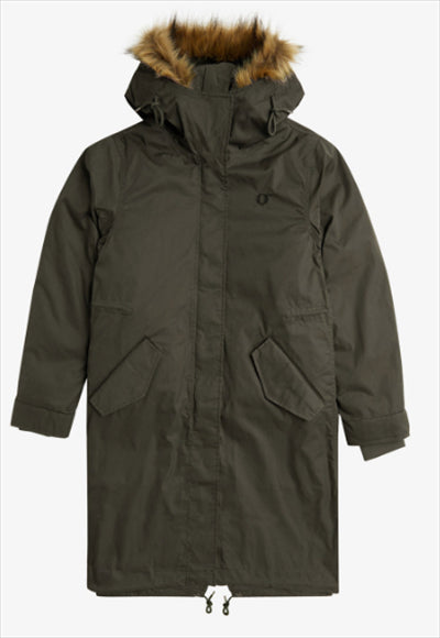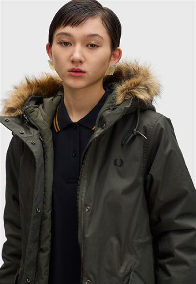 سترة بغطاء رأس من تصميم فريد بيري، سترة بغطاء رأس من تصميم ذيل السمكة. الجسم مصنوع من النايلون القطني خفيف الوزن، والجسم مزود بحواف من الفرو الصناعي قابلة للإزالة، وجيوب بغطاء، وحبال سحب عند غطاء الرأس، وحزام خصر.