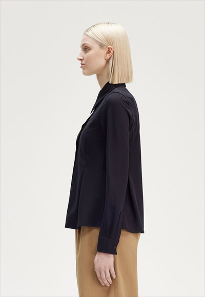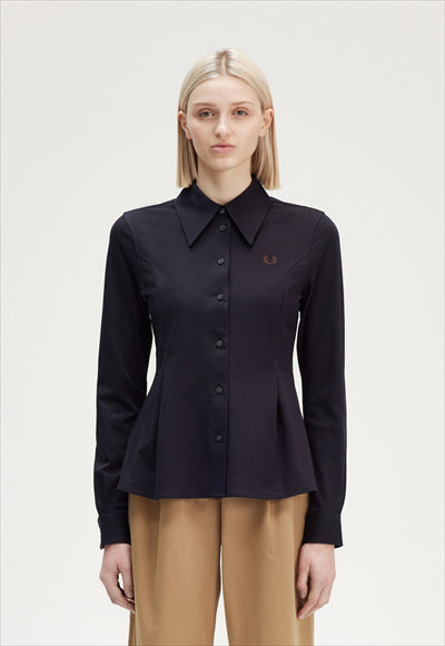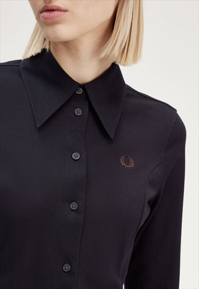 قماش شبكي من القطن المنسوج / قصة عادية مع خصر ملائم / أزرار من خلال فتحة الصدر / ياقة كبيرة الحجم / شعار إكليل الغار مطرز على الصدر الأيسر