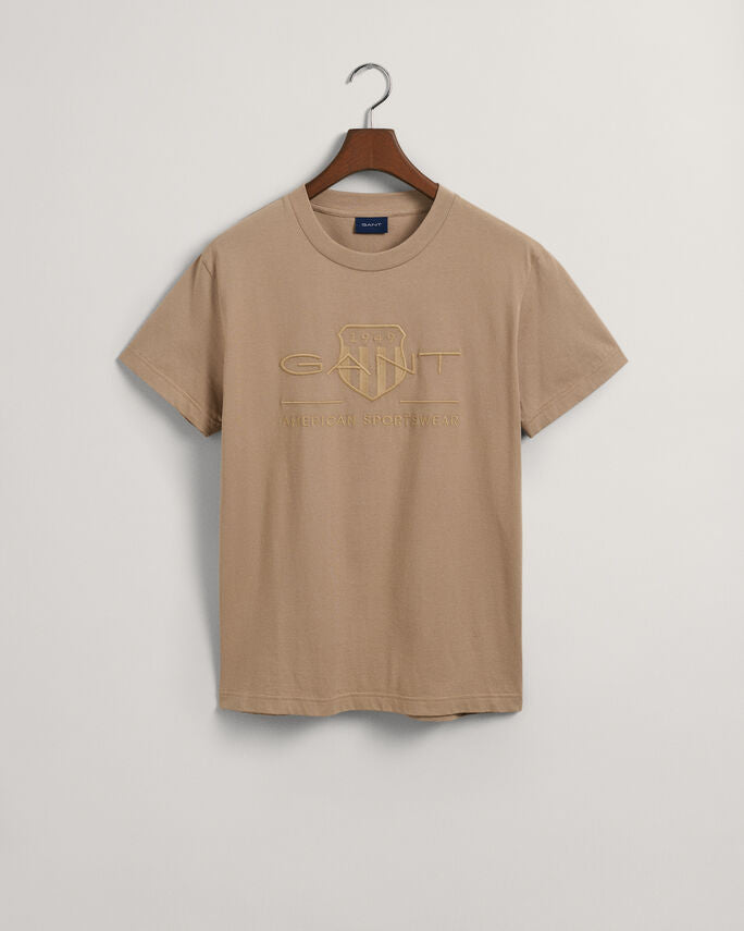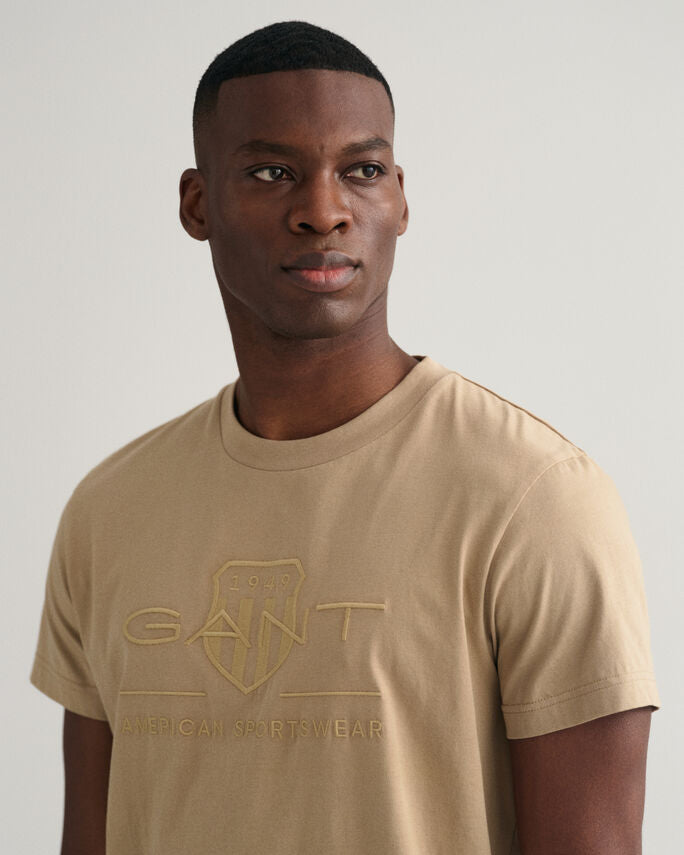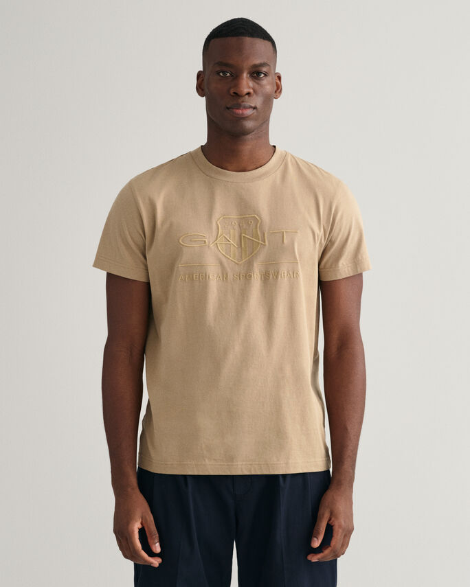 قطعة أساسية كلاسيكية للارتداء اليومي، هذا التيشيرت القطني 100% بياقة دائرية، يتميز بتصميم كاجوال مع تطريز شعار درع الأرشيف بلون متناسق على الصدر.