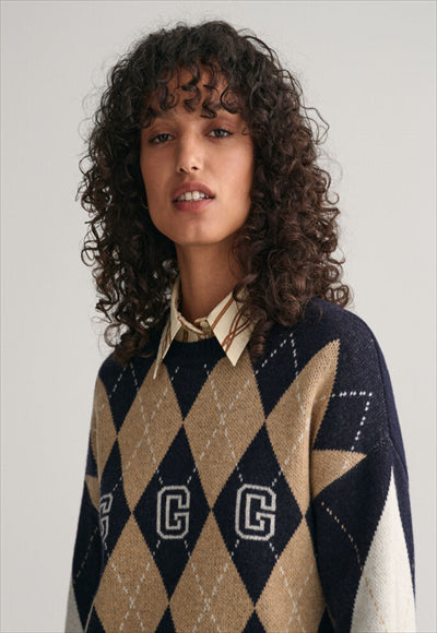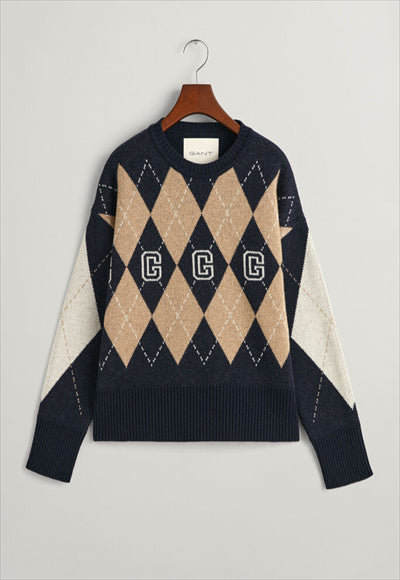 صُنعت هذه السترة ذات الرقبة الدائرية باستخدام نسيج جاكار ممتاز على شكل عين الطير، وهي مصنوعة من صوف الحمل الإيطالي فائق النعومة. تصميم مريح وأجزاء متساوية، تم تصميم التصميم بنمط أرجايل شامل يتميز بحروف مدمجة مستوحاة من الجامعة في الأمام والأكمام. تم قصه لملاءمة عادية، ويتضمن التصميم أيضًا تفاصيل مضلعة عند الرقبة والأصفاد والحاشية.