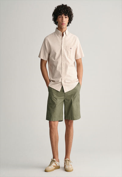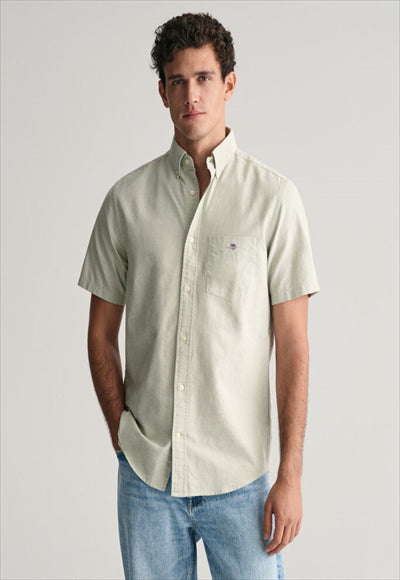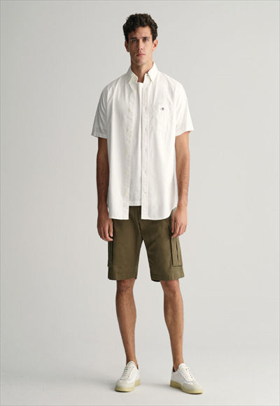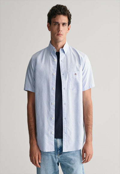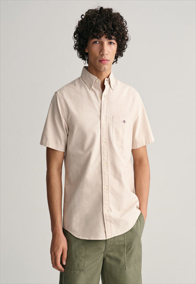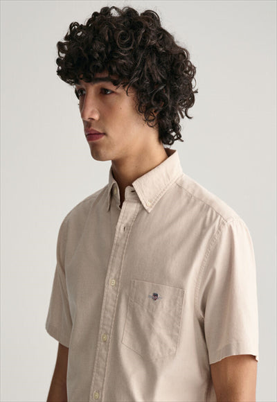 قميص أكسفورد هذا مصنوع من القطن المتين، وهو ضروري في مرحلة الإعداد. تم تصميم هذا القميص بقصة عادية وأكمام قصيرة لأشهر الصيف الأكثر دفئًا. يتميز بياقة بأزرار سفلية، وحاشية منحنية، وجيب على الصدر مع تطريز درع وطيات مربعة مع حلقة قفل في الخلف.