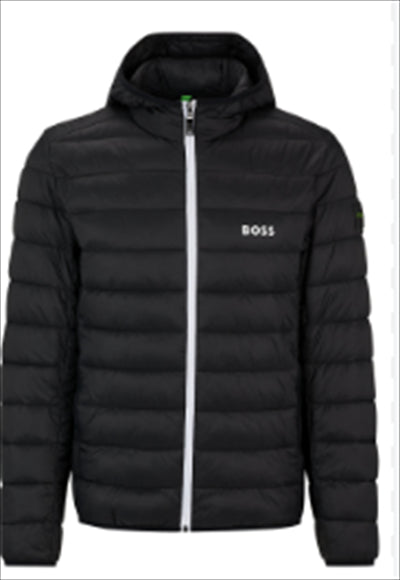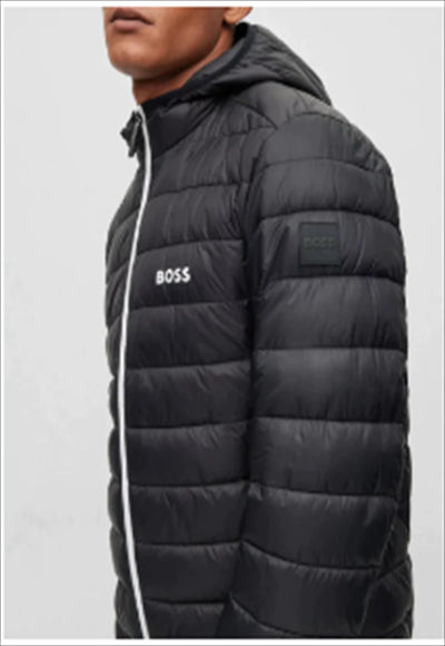 سترة مبطنة بقصة عادية مصنوعة قماش طارد للماء مع لمسات تحمل العلامة التجارية BOSS تناسب منتظم طوق مقنع إغلاق بسحاب مكتمل الصف طول قياسي طول الظهر المناسب: 69 سم