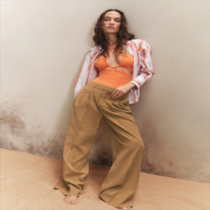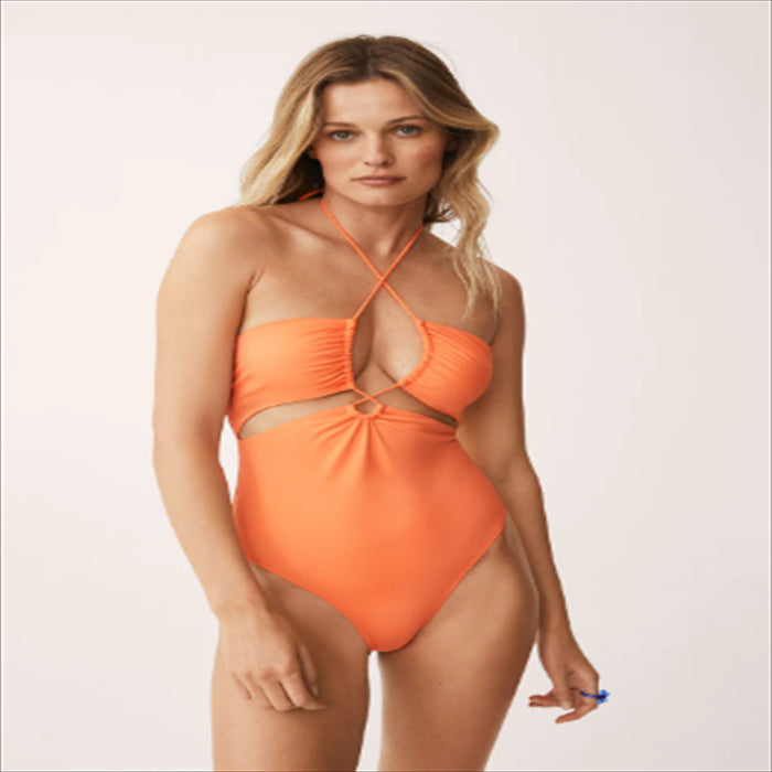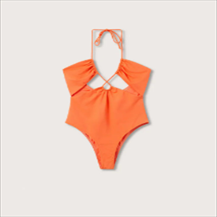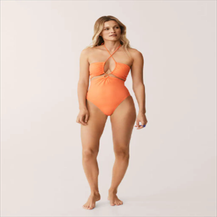 امرأة ترتدي بدلة استحمام برتقالية نيون. امرأة في بدلة استحمام برتقالية براقة.