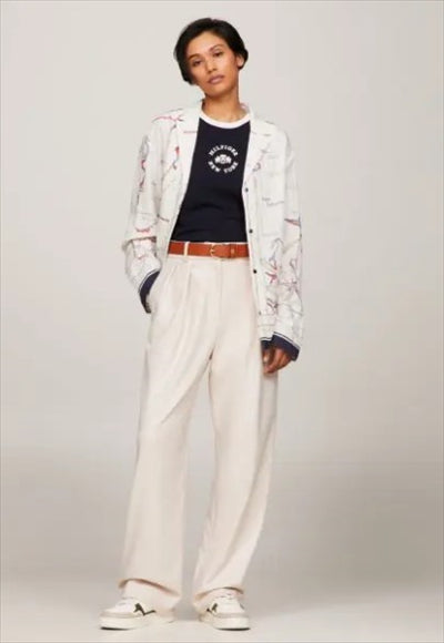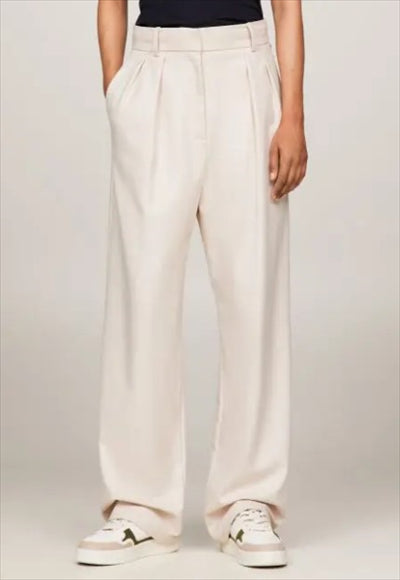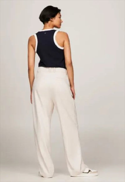 مزيج من البوليستر المعاد تدويره مصبوغ الصباغ ثنيات على الجبهة خصر مطاطي جيبان خلفيان بحاشية العلامة التجارية تومي هيلفيغر 66% بوليستر مُعاد تدويره، 32% فيسكوز EcoVero™، 2% إيلاستين مقاس مريح الساق المستقيمة تصميم سهل الارتداء