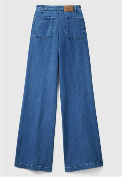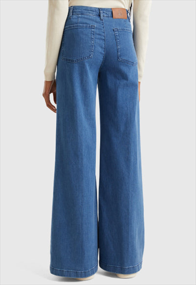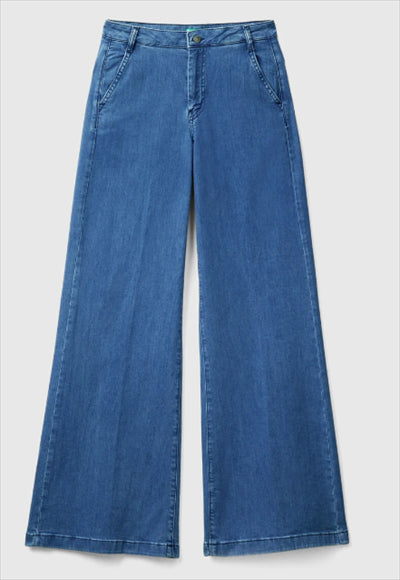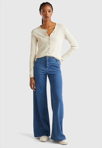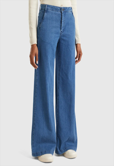 بنطلون طويل من الدنيم المطاطي. تصميم مستوحى من الطراز الكلاسيكي لا ينفد أبدا ، مع ساق واسعة واسعة وجيوب أمامية وجيوب خارجية في الخلف.