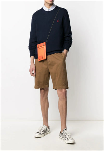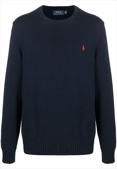 كنزة منسوجة بشعار مطرز من تصميم POLO RALPH LAUREN باستخدام القطن، يتميز هذا المنتج برقبة دائرية وأكمام طويلة وأكمام مضلعة وشعار مطرز على الصدر وأطراف مضلعة.