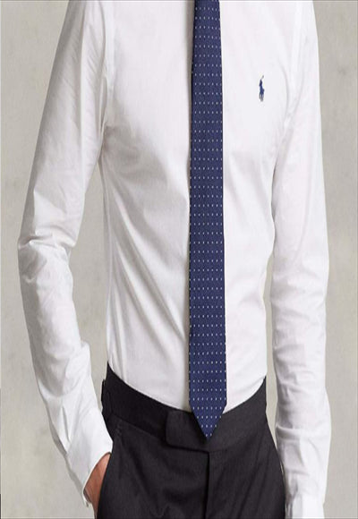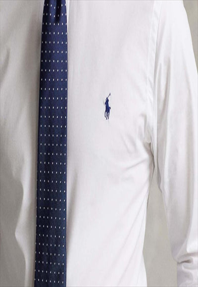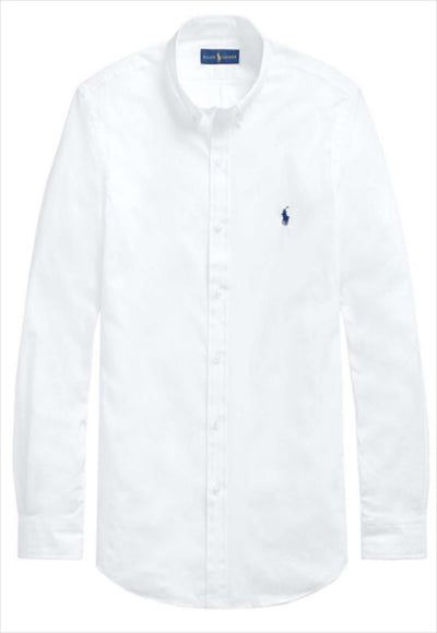 قميص رجالي بقصة ضيقة وأكمام طويلة وأزرار على الياقة وشعار الماركة مطرز على الصدر. (التركيب: قطن)
