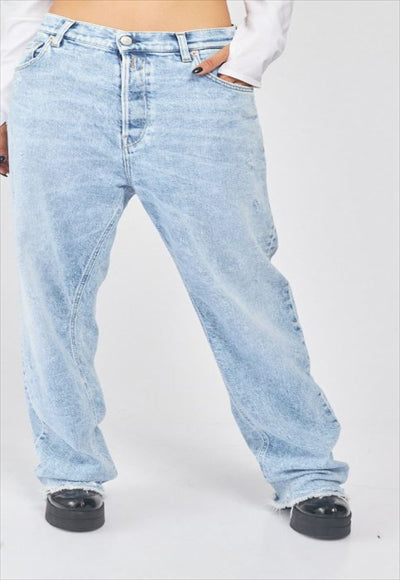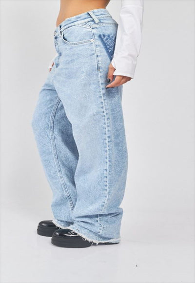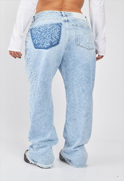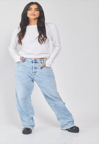 جينز بقصة عالية ومستقيمة بأسلوب التسعينيات. يحتوي البنطلون على تفاصيل في الجيب الخلفي والأطراف. نحيف